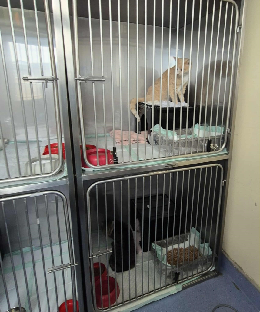 After the Radioactive iodine has been administered, the patient is moved straight to our special isolation boarding facility on site, where they will be well cared for by our qualified and trained nursing and veterinary staff for the next 7 days. Each patient has their own large cage (bedding, bowls and food supplied) and there are large windows in the room for natural light, allowing the cats to happily see outside.