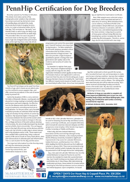 For more information on whether PennHIP screening would be a good option for your dog, please call McMaster and Heap Veterinary Practice and speak to either Michele or Sonya.